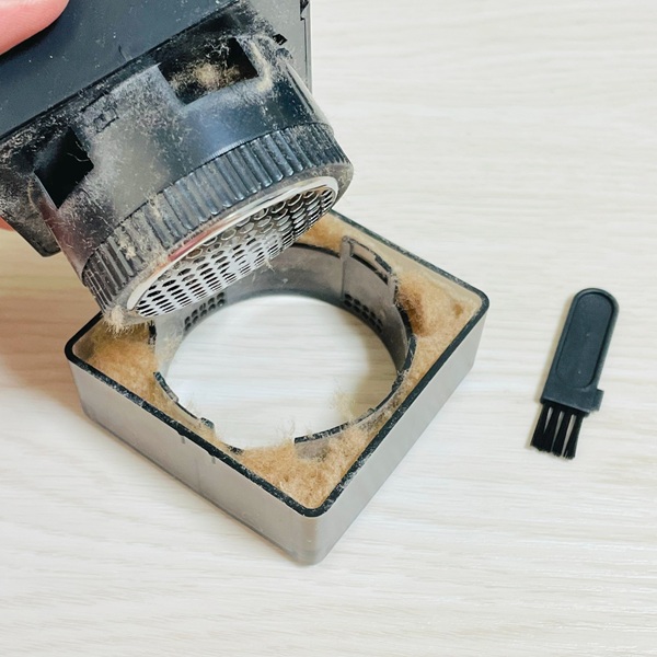 電動毛玉取りはこのようなキューブタイプで、スケルトン部分に毛玉が入るようになっています。