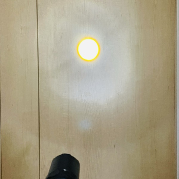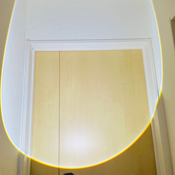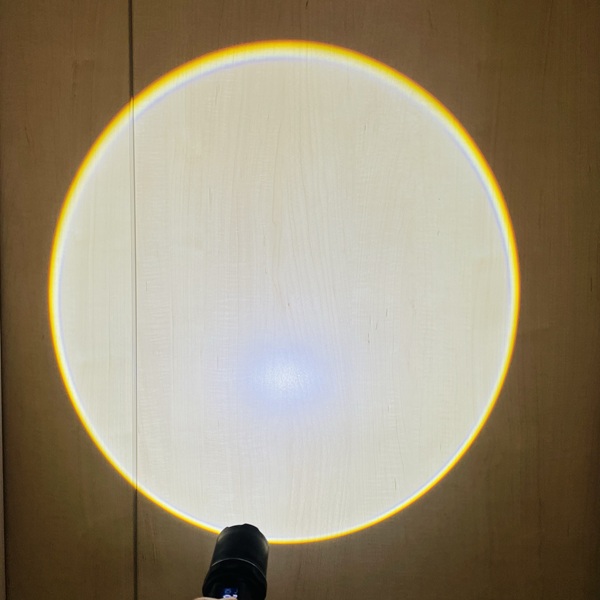 扉を超えて壁まで照射されているため若干いびつな円に見えますが、平らなところですときれいな円を描きます。